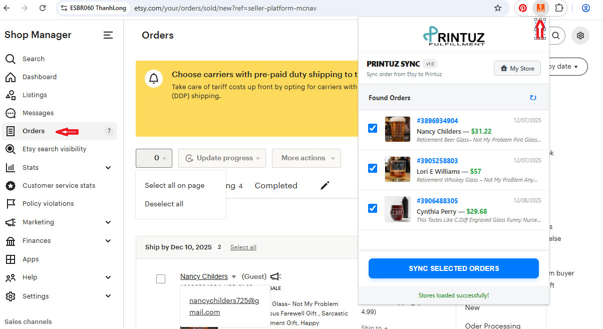 - Vào extension, chọn các order muốn syns lên hệ thống r bấm Syns Selected Orders.