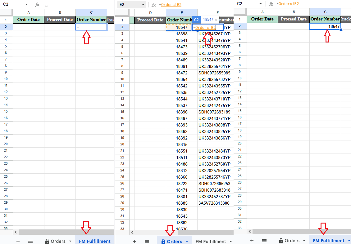 - trong trang tính FM Fulfillment : làm lệnh = ở ô C2 của cột Order number