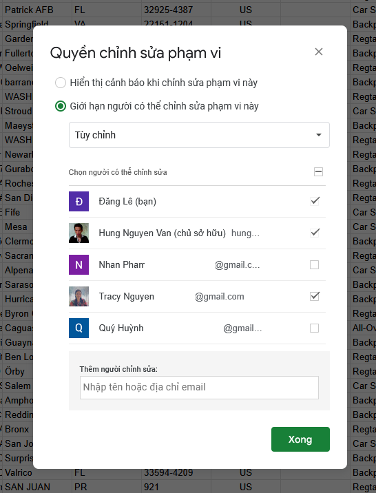 Chọn các user có thể chỉnh sửa trang tính, ở đây giới hạn ko cho vendor sửa. còn các trang tính khác thì thoải mái