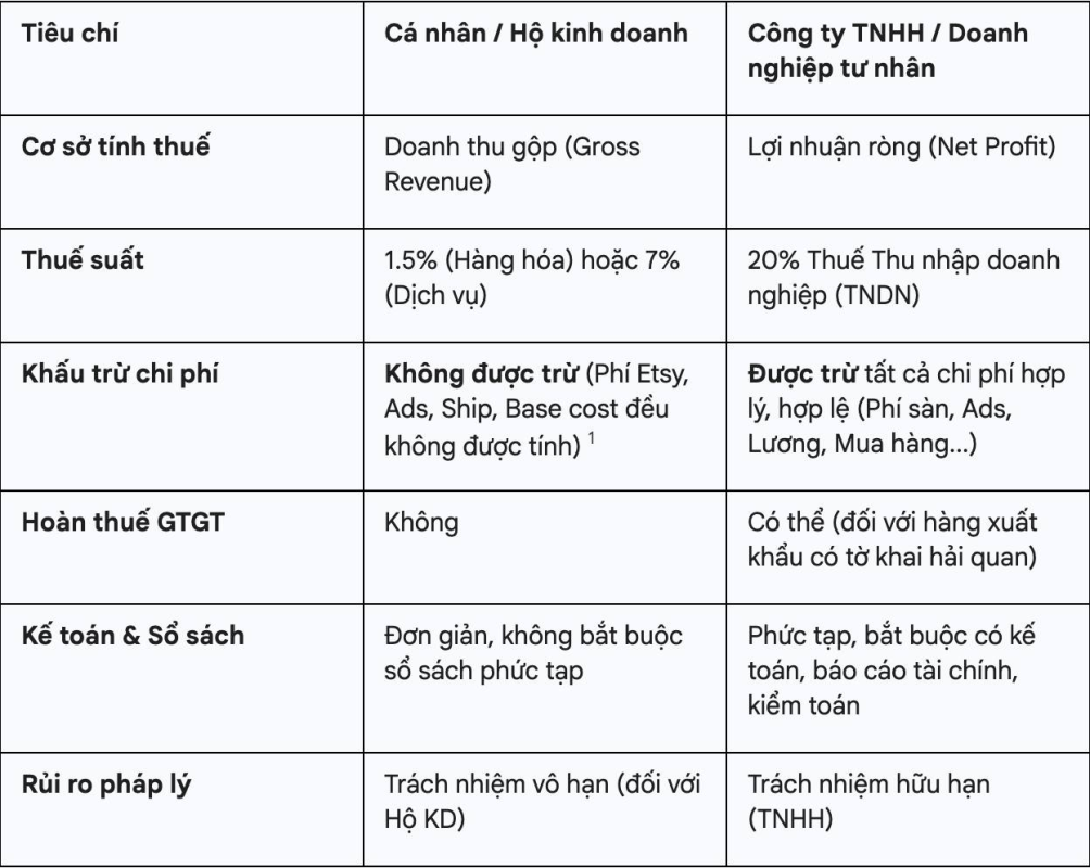 - Khi doanh thu từ Etsy tăng trưởng (ví dụ: trên 2-3 tỷ đồng/năm), nhiều seller cân nhắc việc thành lập doanh nghiệp. Dưới đây là bảng so sánh chi tiết để hỗ trợ ra quyết định. (Trong hình ảnh)