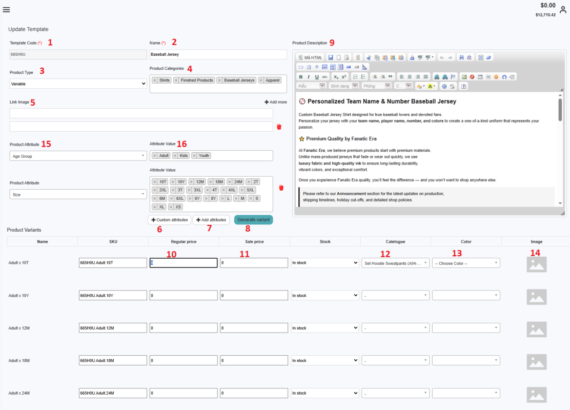- Template Code: Mã mẫu sản phẩm để quản lý nội bộ, hệ thống tự gen
